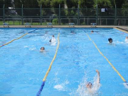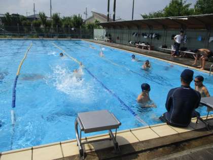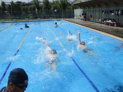 水泳の授業風景です。今日は記録会の日だそうです。ウォーミングアップに余念がありません。最後まで力を出して下さいね〜。