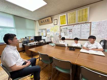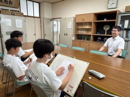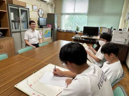 美術部2年生が部展に向けて共同作品の作成に取り組んでいます。今日は校長先生の似顔絵を描きに校長室にやってきました。夏休みに入ったら、共同作品の大きなキャンパスに似顔絵を描きなおしていくそうです。作品完成が楽しみです。