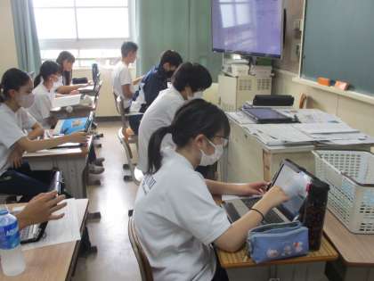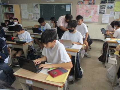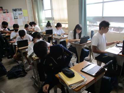 3年生の様子です。PCでの意見交換をしています。社会科公民の授業です。