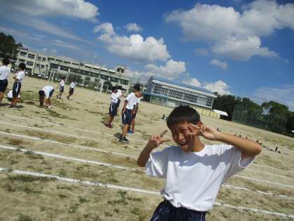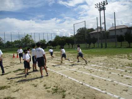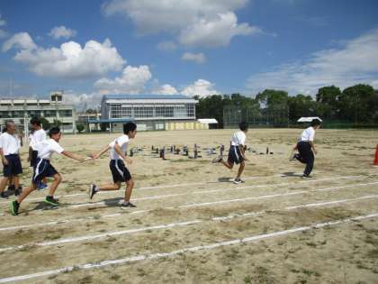 1年生の授業風景です。「バトンリレーの調子は?」「イエ〜イ、いい調子!」