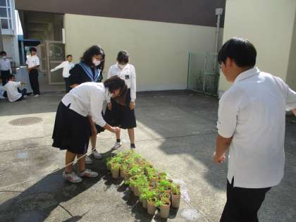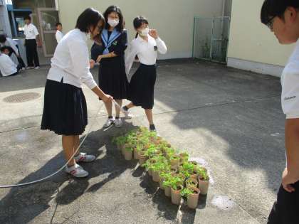 技術家庭科で栽培中のニンジンに水をあげています。毎日お世話してるとかわいくなってきますね。