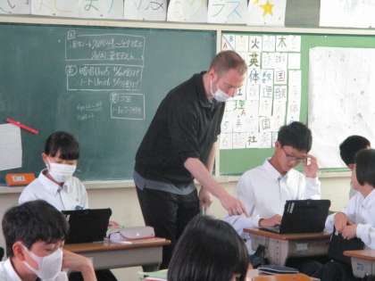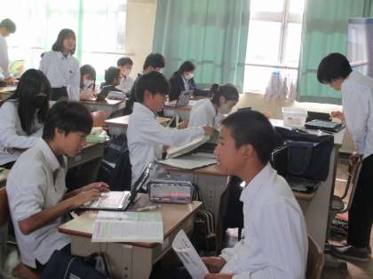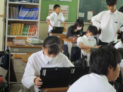 1年生の授業風景です。英語ではPCを使っての取り組みで、英語での表現が分かりにくい生徒に対して、ロビン先生が生徒一人一人の様子を見て、声掛けしてくれていました。
