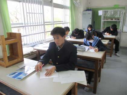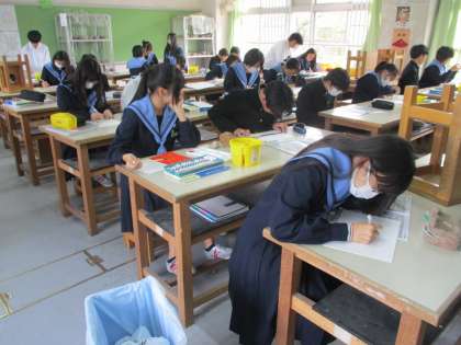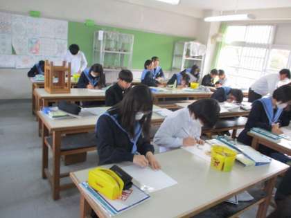 2年生です。美術でした。漢字を一文字選んで、その意味を絵に模してその一文字を描くという取り組みです。
