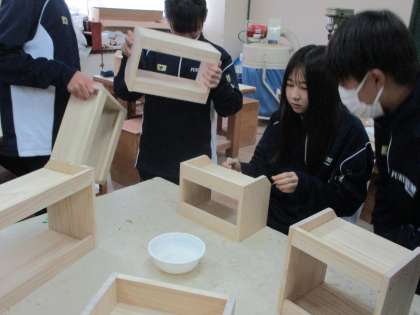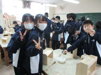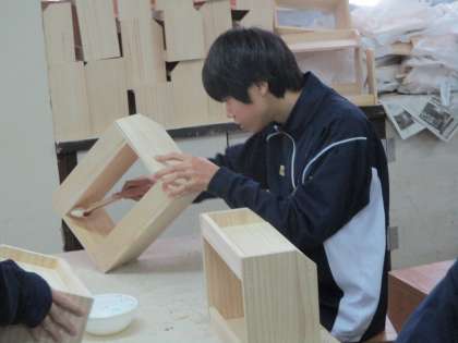 1年生技術、本棚の仕上げでニス塗りです。慎重に作業していました。