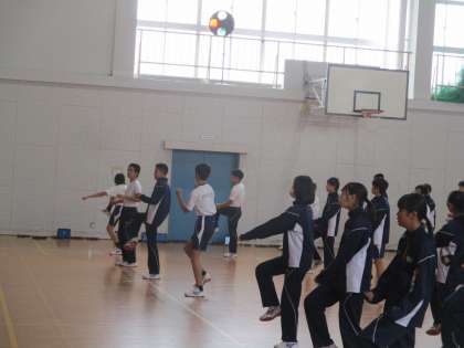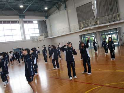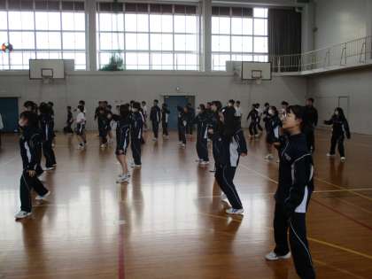 2年生体育のダンスです。舞台で先生がお手本を示してくれます。なかなか難しい動きで、少しずつアクションが増えていき、生徒もついていくのに必死でした。完成形が楽しみです。是非披露会には呼んでね〜。