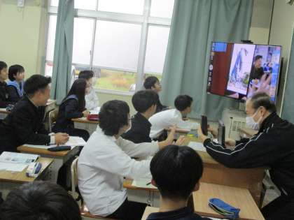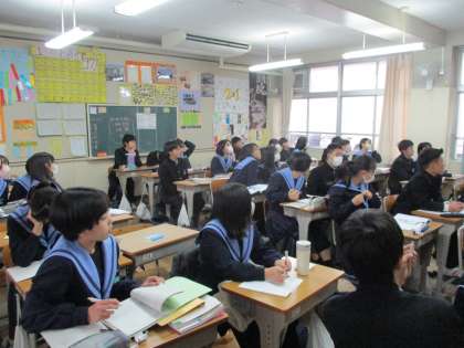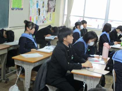 2年生です。気象図についてを学んでいるところでした。先生が台風の時に近所で起こった被害を映像に撮っていたものを紹介して、台風の凄まじさを実感していました。