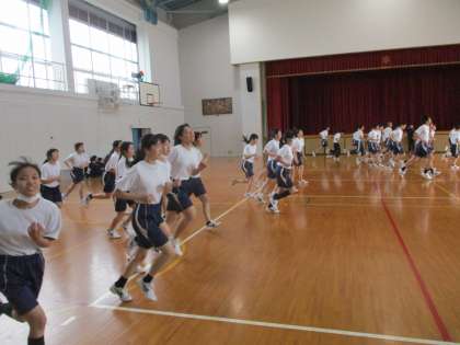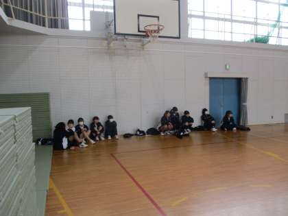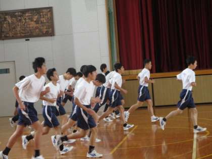 3年体育は、雨の影響で運動場が使えないのでシャトルランを行っています。
