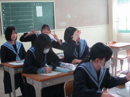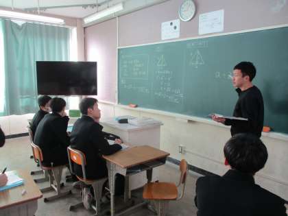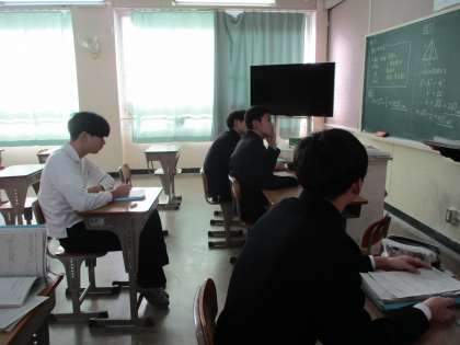 本日も、朝は指先が痛くなる厳しい冷たさのある朝でした。曇天で気温が上がらなさそうな空です。まず、3年生の様子からになります。数学では、三平方の定理を使った学習を進めていました。