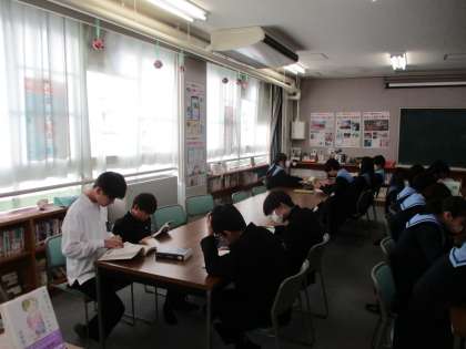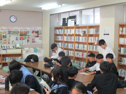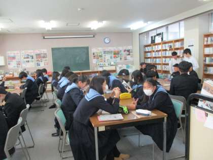 2年生です。図書室に来ています。図書室の書籍を使って調べ学習中です。PCでの調べ学習とは一味違った雰囲気に、新鮮な気持ちで取り組めていました。