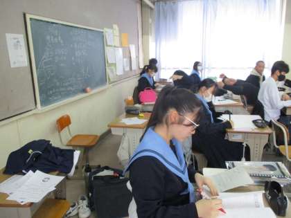 いよいよ3年生は私立高校入試まであと2日となりました。授業では、先生の説明を食い入るように見つめて復習に励みます。是非、努力の塊を大きな自信にして臨んで下さい。