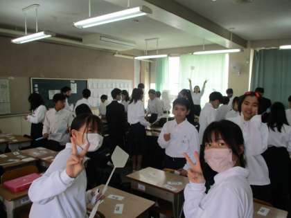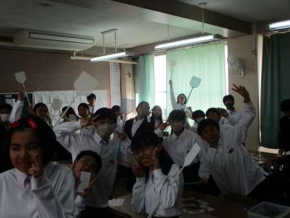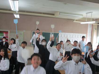 1年生です。英語では、道具を利用して単語カード争奪戦を行っていました。