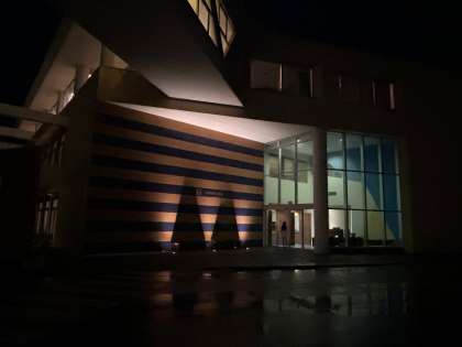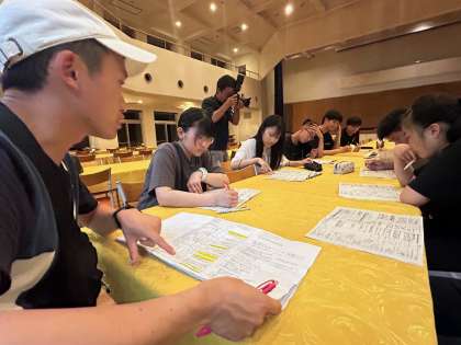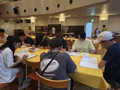 建物の写真は入館式・朝食・夕食・室長会議・レクを行ったオーシャンホールの外観です。明日の退館式もここで行われます。