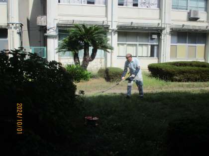 今日の日中は気温が上がってきました。技術職員さんが、中庭の草を電動カッターで刈ってくださっています。暑い中、誠にお疲れ様でした。