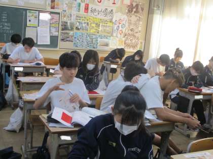 朝の様子です。登校風景や朝学習時間の様子になります。明日からの中間テストに向けて、気持ちが高まっているようです。