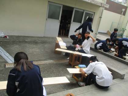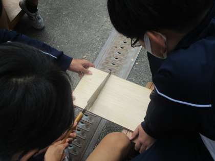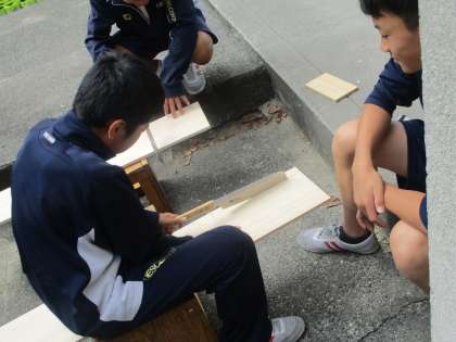 技術では、本棚の製作を行っていました。のこぎりに苦戦中〜!頑張って!!
