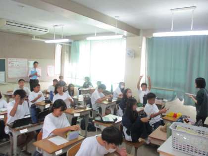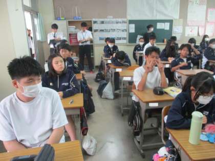 本日6時間目に、中教研総合的な学習部会公開授業を行いました。防災に関する学習の一環として、1年生の各クラスで堺産の食材を使用したメニュー作りのコンペを行いました。全6時間の授業の中の最終回で、最後に投票と表彰も行いました。全員が、他の班の意見やアイデアを否定しない、ウェルカムな雰囲気の中で、それぞれの班がアイデアを発表できていました。ご来校いただいた市教委・各中学校の先生方におかれましては、本当にありがとうございました。