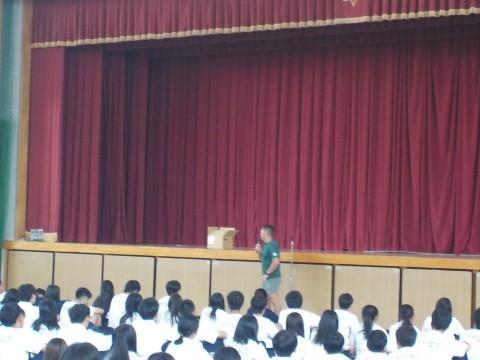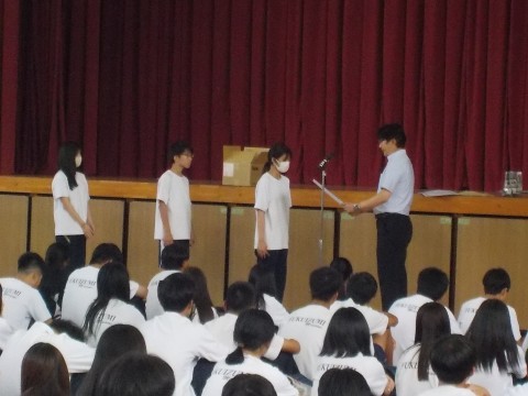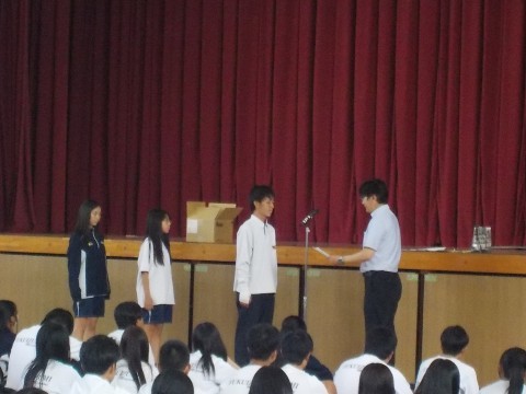 本日、6時間目に全校集会と生徒会や各種委員会の認証式が行われました。校長先生のお話では、プロゴルファーを目指す本校のOB高校生が、近隣で行われたプロゴルフの試合に出場した話で、夢を実現するために着実に階段を上っているお話でした。生徒指導の先生からは、健全育成俳句の優秀賞と最優秀賞の発表がありました。
