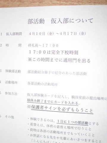 教室では、部活動に関する書類が担任の先生より配布されました。