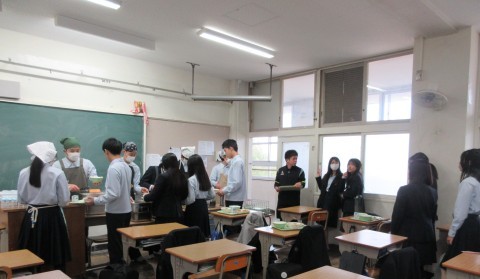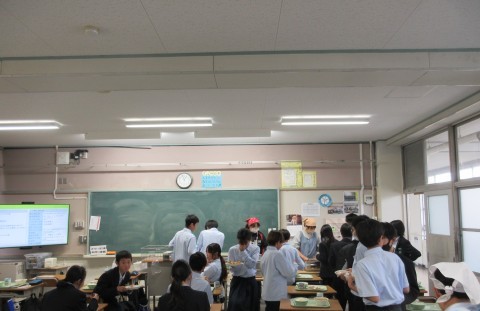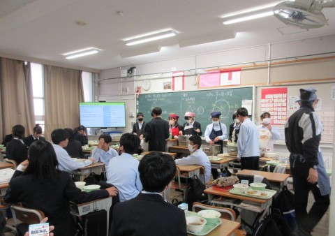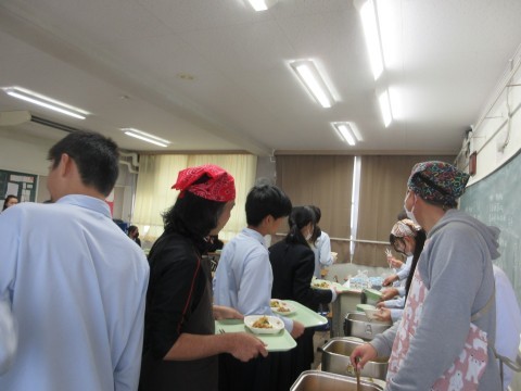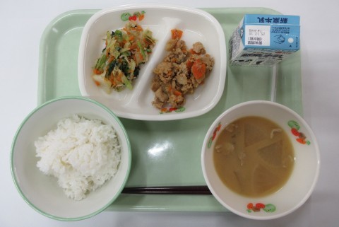 本日の献立は、ごはん・牛乳・豚ロースのピリ辛炒め・ごまじゃこ和え・さつま汁です。