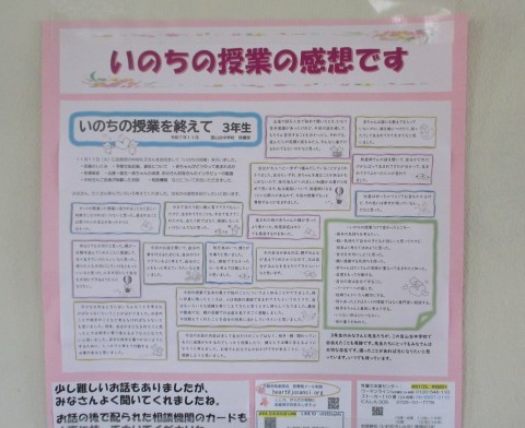 11月11日(火)に実施した「いのちの授業」の感想が3年生のフロアに掲示されていました。