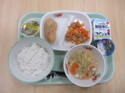 本日の献立は、ごはん・牛乳・さばのしょうが煮・小松菜と豚肉の甘辛炒め煮・のっぺい汁です。