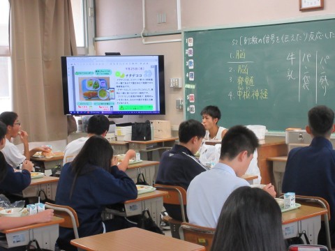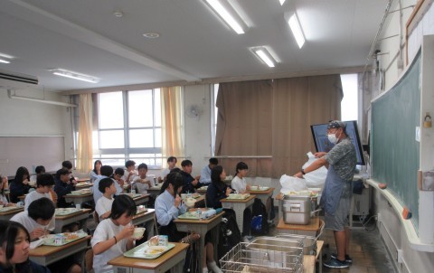 本日の給食の献立は、コッペパン・鶏肉とキャベツのガーリック炒め・コーンと卵の中華スープ・フルーツコンポートです。