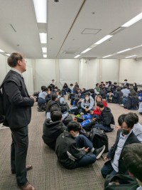 大阪城公園に到着して、今日の活動の説明をしています。これから班活動が始まります。