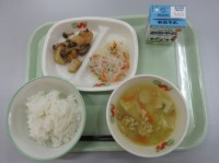 本日の献立は、ごはん・牛乳・ワンタン・きのこと鶏肉のみそ焼き・バンサンスーです。