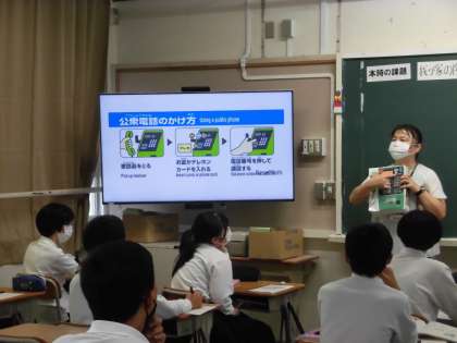 公衆電話の使い方を確認しています。小銭かテレホンカードが必要なことを忘れないでください。