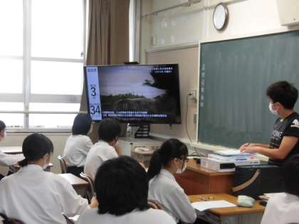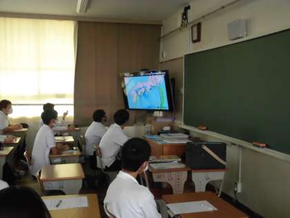 3年生も、修学旅行に向けて、総合的な学習の時間で、防災学習を行っています。この時は、南海トラフ沖での地震についてのビデオを見ていました。