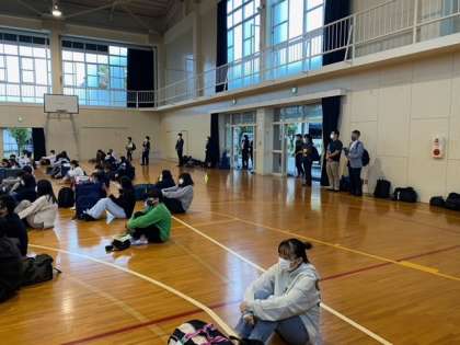 おはようございます。雨なので体育館に集合しました。他学年の先生方も見送りに来てくれました。