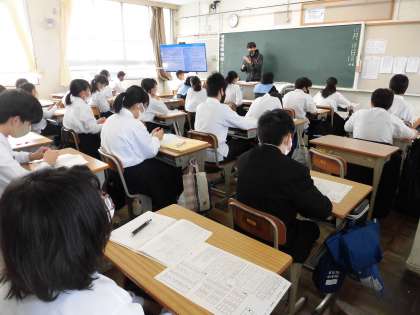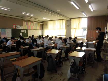 1組の英語は少人数指導です。各教室でテストの解説をしているところでした。単語の間違いは10回、文章は5回書くという課題が出ていました。テストは、受けた後が大切です。間違えた問題、わからなかった問題をそのままにせず、必ずやり直して身につけましょう。