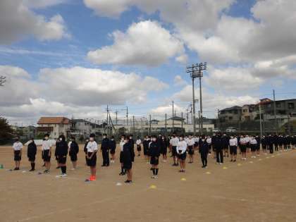 ソーシャルディスタンスを確保して並べるよう体育委員が指示し、1分で並べるようになりました。