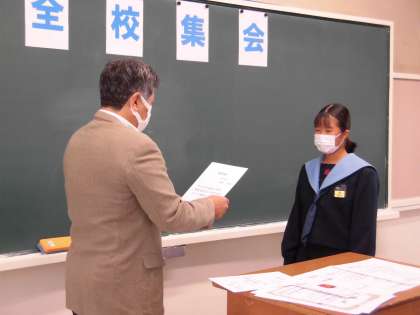 1年学年代表です。 認証式の後、校長先生からのお話がありました。