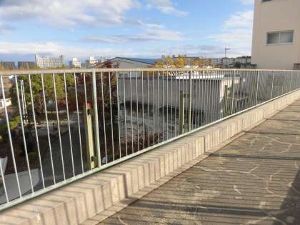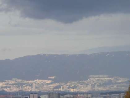 早朝から考えると、日中はよく晴れました。遠く六甲山のふもとの町までよく見えています。秋が深まった日差しが入った、3階の渡り廊下です。