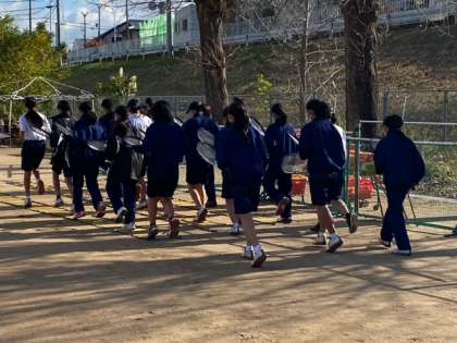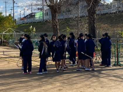 ソフトテニス部は元気なあいさつをしてくれました。その後、ラダーを使ってウォーミングアップをしていました。