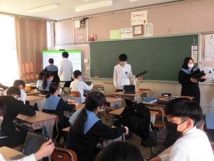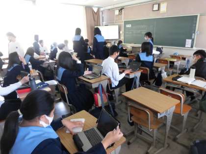 休憩をはさんで、生徒会選挙です。今回はPCを使っての選挙となります。各クラスで、PCの準備をしています。