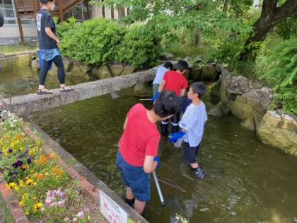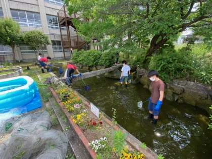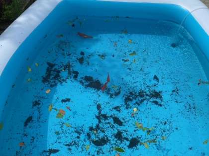 水を抜きながら、金魚を救って、プールに避難させています。