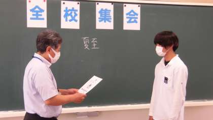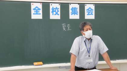 始めに,校長先生から,来週の月曜日から期末テストが始まることと,夏至についてお話がありました。大阪よりも東にある北海道の方が日の入りが遅いなんて,不思議ですね。