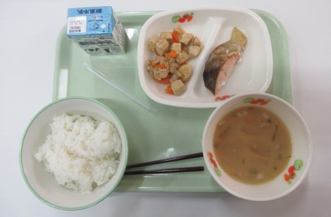 本日の献立は、ごはん・牛乳・さばのおろしだれ・じゃがいものいそ煮・小松菜のみそ汁です。