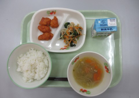 今日の献立は、ごはん・牛乳・ヤンニョムチキン・ほうれん草ナムル・中華コーンスープです。
