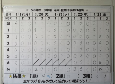 2年生では、先週1/19(月)~1/23(金)の1週間を遅刻・授業準備ゼロ週間として取り組みました。