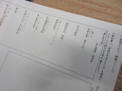この詩を音読するときの読み方をグループで考えています。