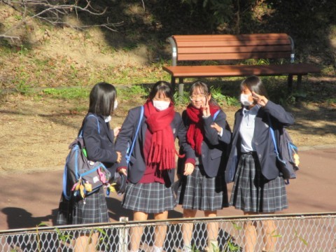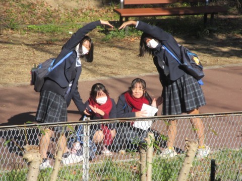 2年生の給食の写真を撮るために廊下を歩いていたら、下校途中の3年生が緑道から思わずポーズ!