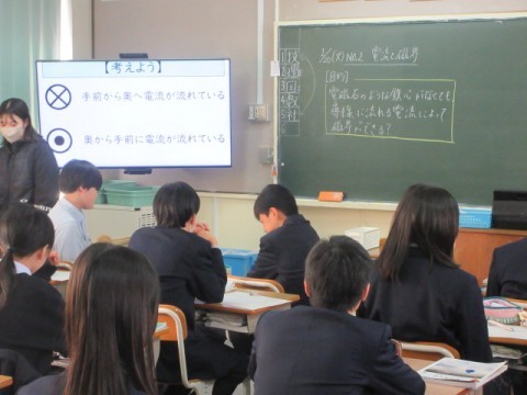 「電磁石のような鉄心がなくても、導線に流れる電流によって磁界ができる?」が授業の目的です。