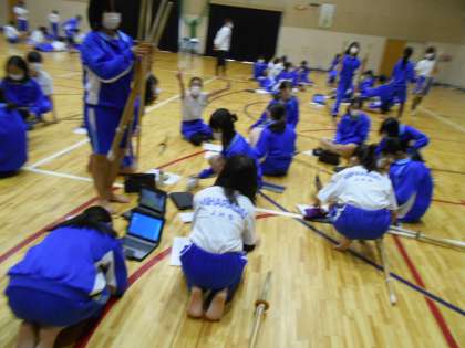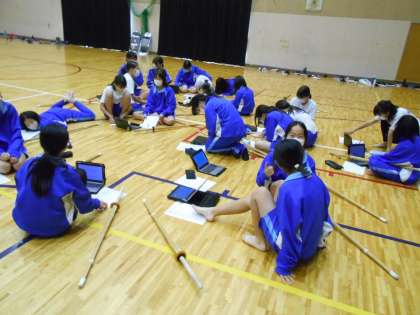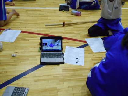 剣道の授業です。タブレットを使って,動画で自分の動きを確認をしています。友人の動きと比較して,自分の動きを見つめなおしています。