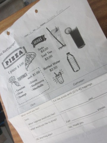 店員さんとお客さんになって、ピザと飲み物のオーダーのやり取りをしています。