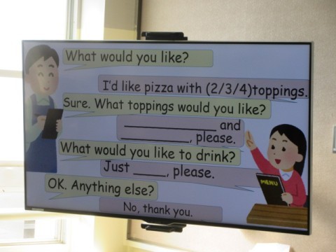ペアで店員さんとお客さんになって、ピザの注文のやり取りをしています。
