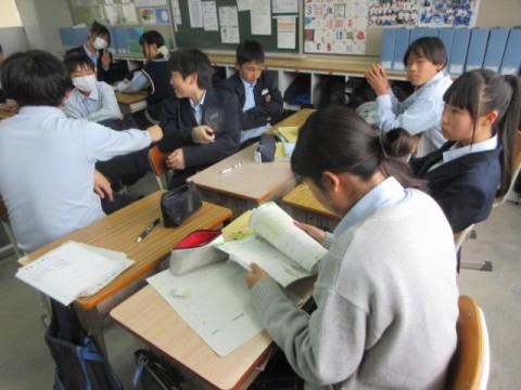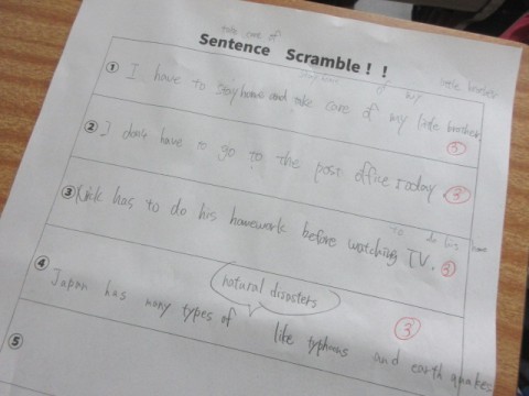 英文の単語をバラバラにして、グループの一人ひとりに与えられた単語を組み合わせて英文を完成させています。