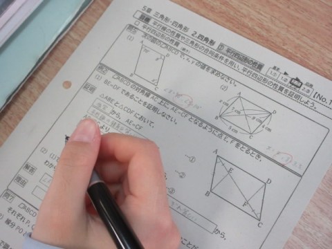 少人数授業で、「平行線の性質や三角形の合同条件を用い、平行四辺形の性質を証明しよう」が今日の目標です。